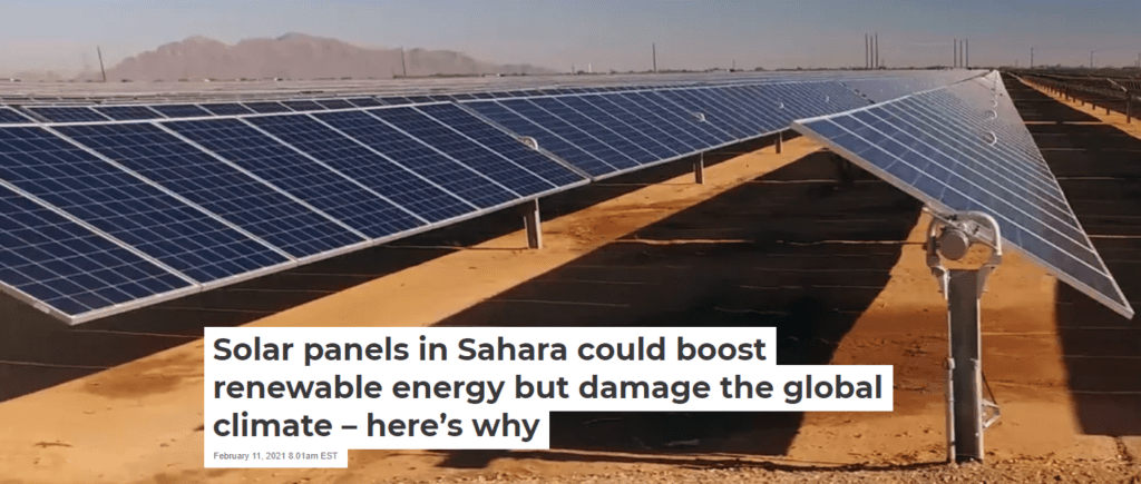 If these effects were only local, they might not matter in a sparsely populated and barren desert. But the scale of the installations that would be needed to make a dent in the world’s fossil energy demand would be vast, covering thousands of square kilometers. Heat re-emitted from an area this size will be redistributed by the flow of air in the atmosphere, having regional and even global effects on the climate.”